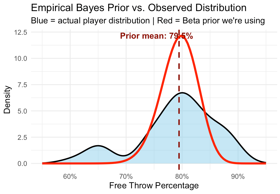 In plain language, empirical Bayes works like this: instead of taking each player's percentage at face value, we start everyone at a league-average baseline, then adjust up or down based on how much data we actually have for them. Players with tons of free throw attempts can move far from that baseline (we trust their numbers). Players with few attempts stay closer to average, because we're less sure about their true skill.